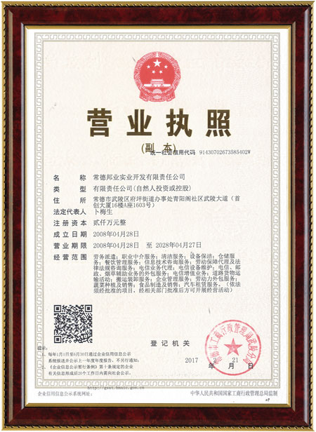常德邦業(yè)實(shí)業(yè)開發(fā)有限責(zé)任公司(原名常德市邦業(yè)人力資源開發(fā)有限責(zé)任公司)是經(jīng)湖南省人力資源和社會(huì)保障廳核準(zhǔn)備案,常德市人力資源和社會(huì)保障局批準(zhǔn),常德市工商行政管理局登記注冊(cè)的一家綜合性人力資源服務(wù)型企業(yè)。公司成立于2008年4月28日,注冊(cè)資本2000萬(wàn)元。